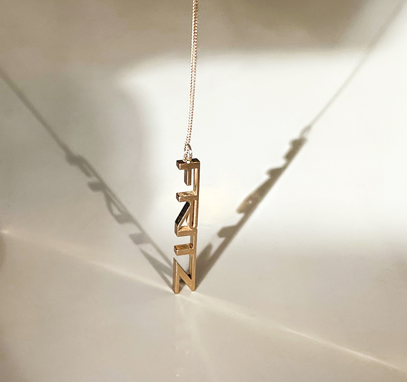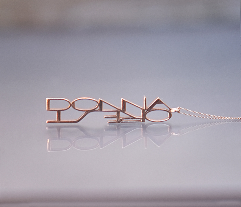 Solid 18 karat rose gold custom necklace pendant designs. Contact the studio for details on ordering your own; choose a name (or two, or a phrase). Below are two examples; ‘DONNA/OREST’ and ‘FRITZ.’